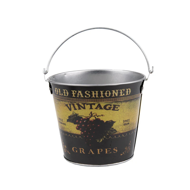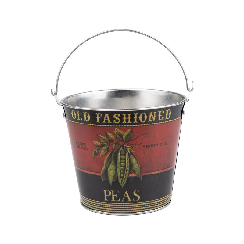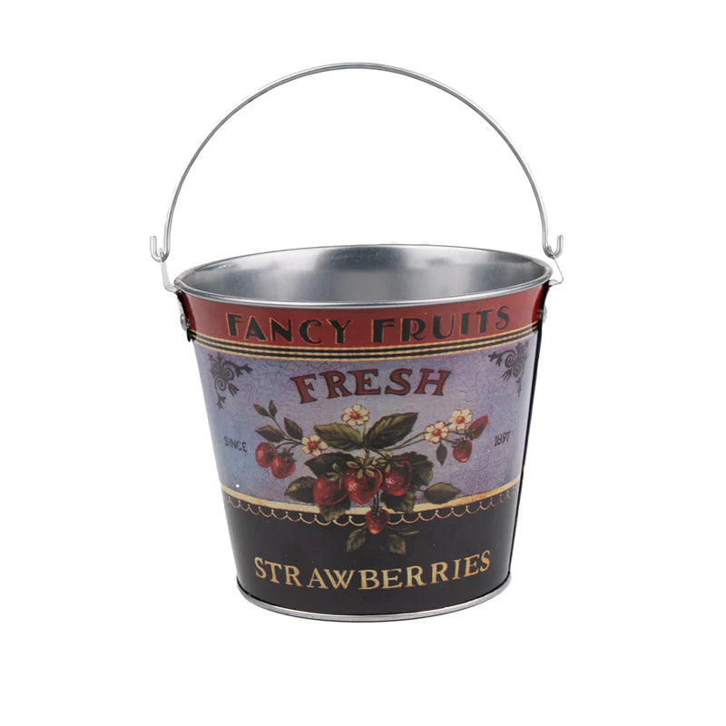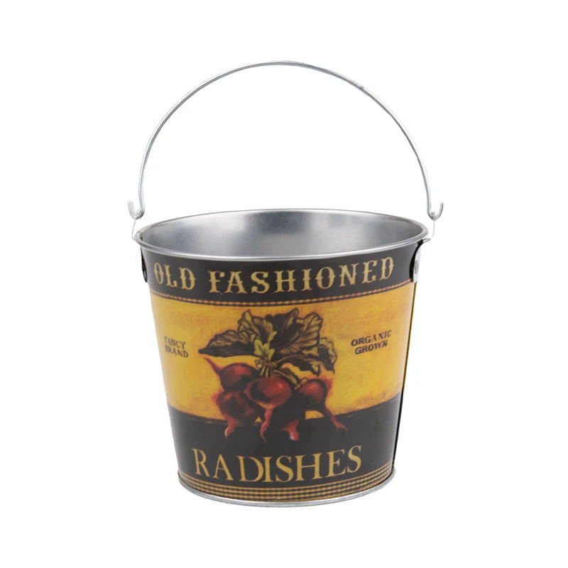 A Beautiful Bundle of 6! Get the complete set of six charming buckets, each featuring unique, old-style illustrations of beloved garden produce: Peas 🫛, Tomato 🍅, Radish, Cherries 🍒, Grapes 🍇, and Strawberries 🍓. It's a truly special collection!